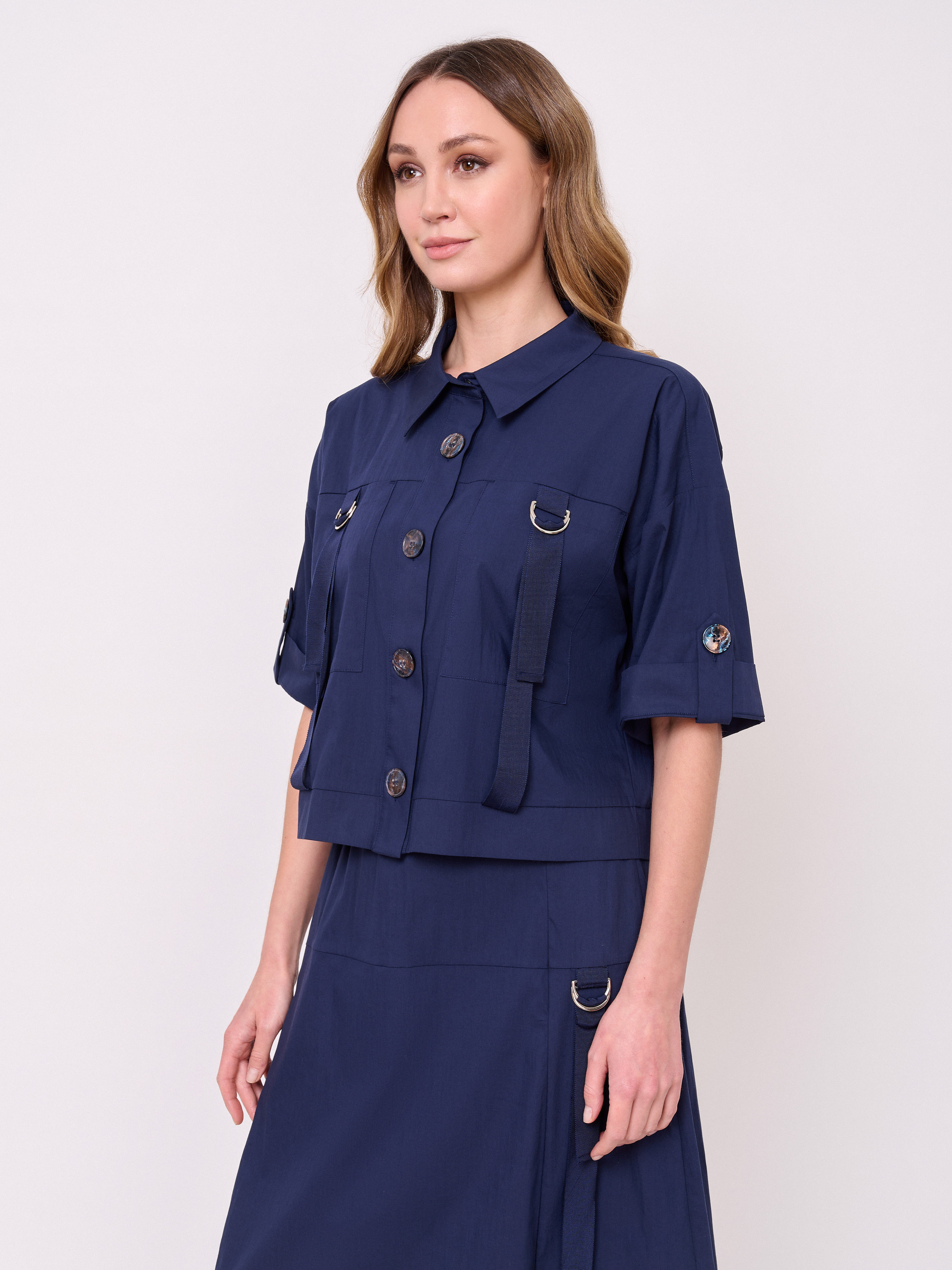 Укороченная блуза-жакет, застежка пуговицы, вырез горловины отложной воротничок, рукава короткие, карманы накладные, хлястики с металлическими пряжками. Длина по спинке: 51 см.
