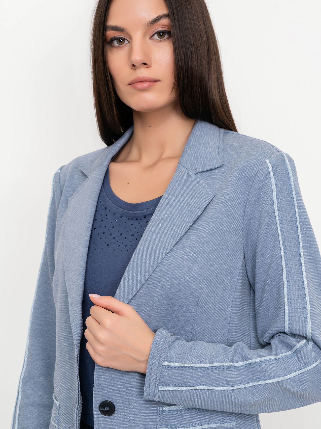 Жакет с лацканами. Застежка на пуговицах. Накладные карманы. Отделка на рукавах и карманах. Базовая модель в нейтральном цвете. Длина изделия по спинке: 60 см.