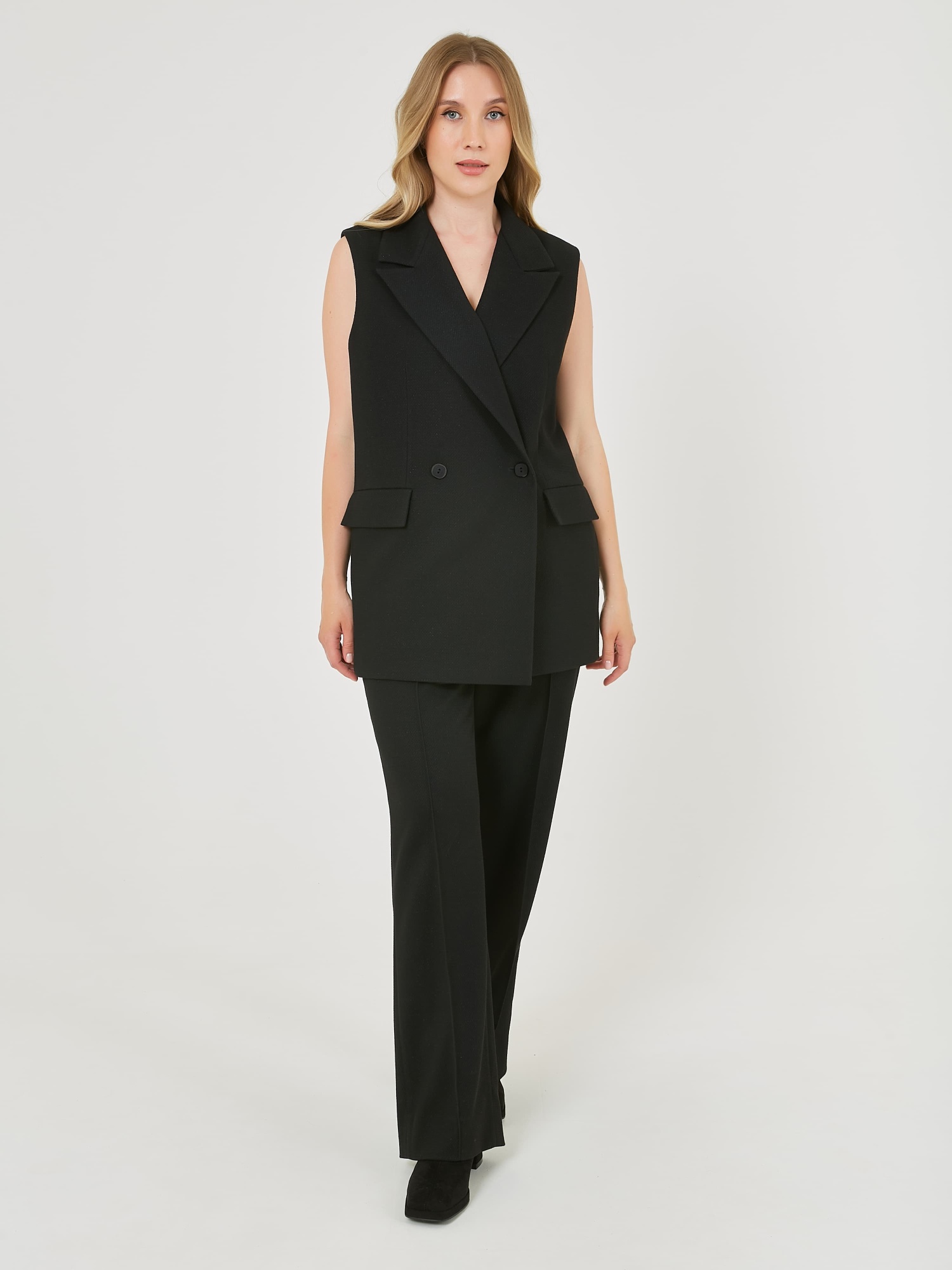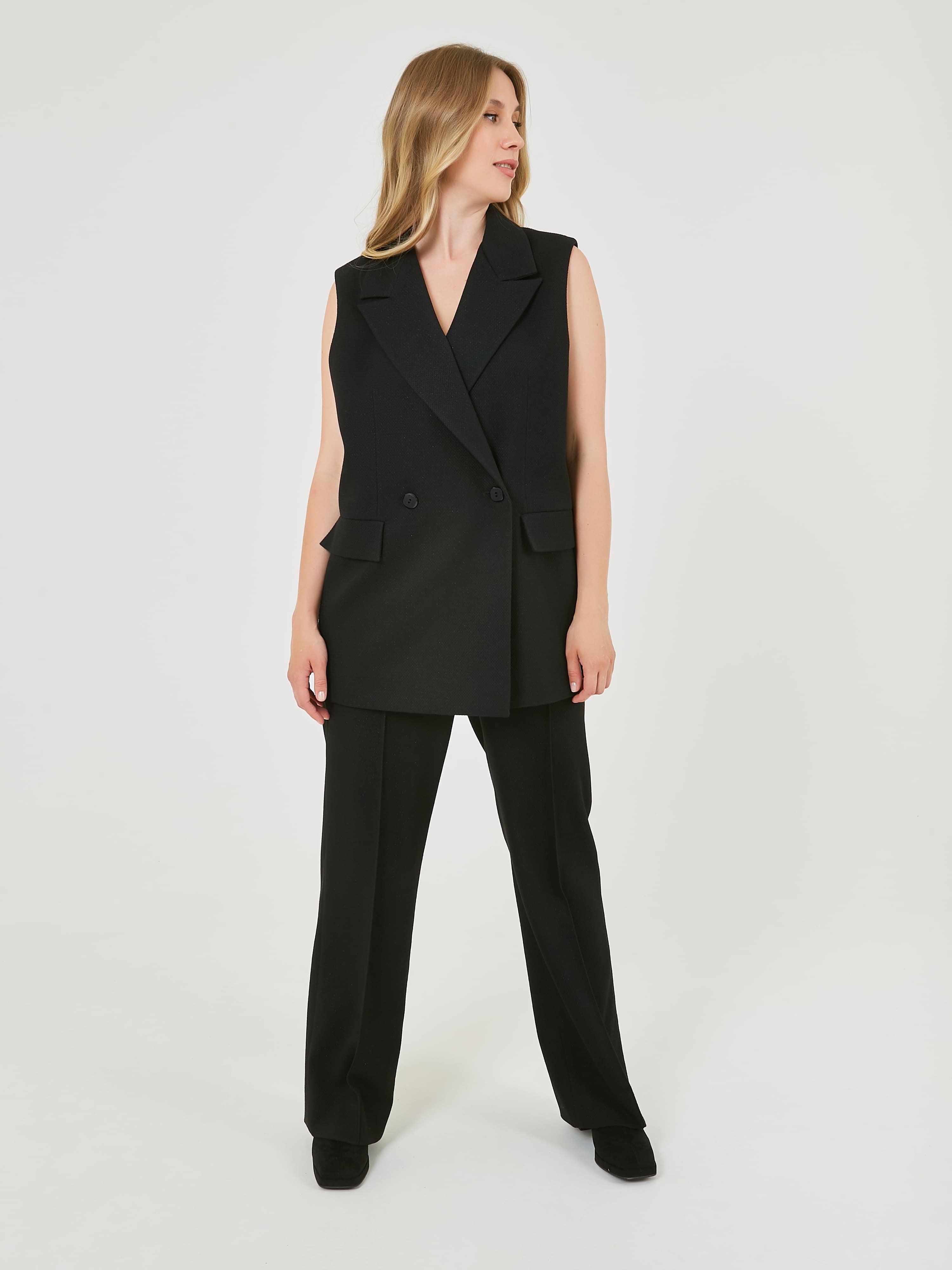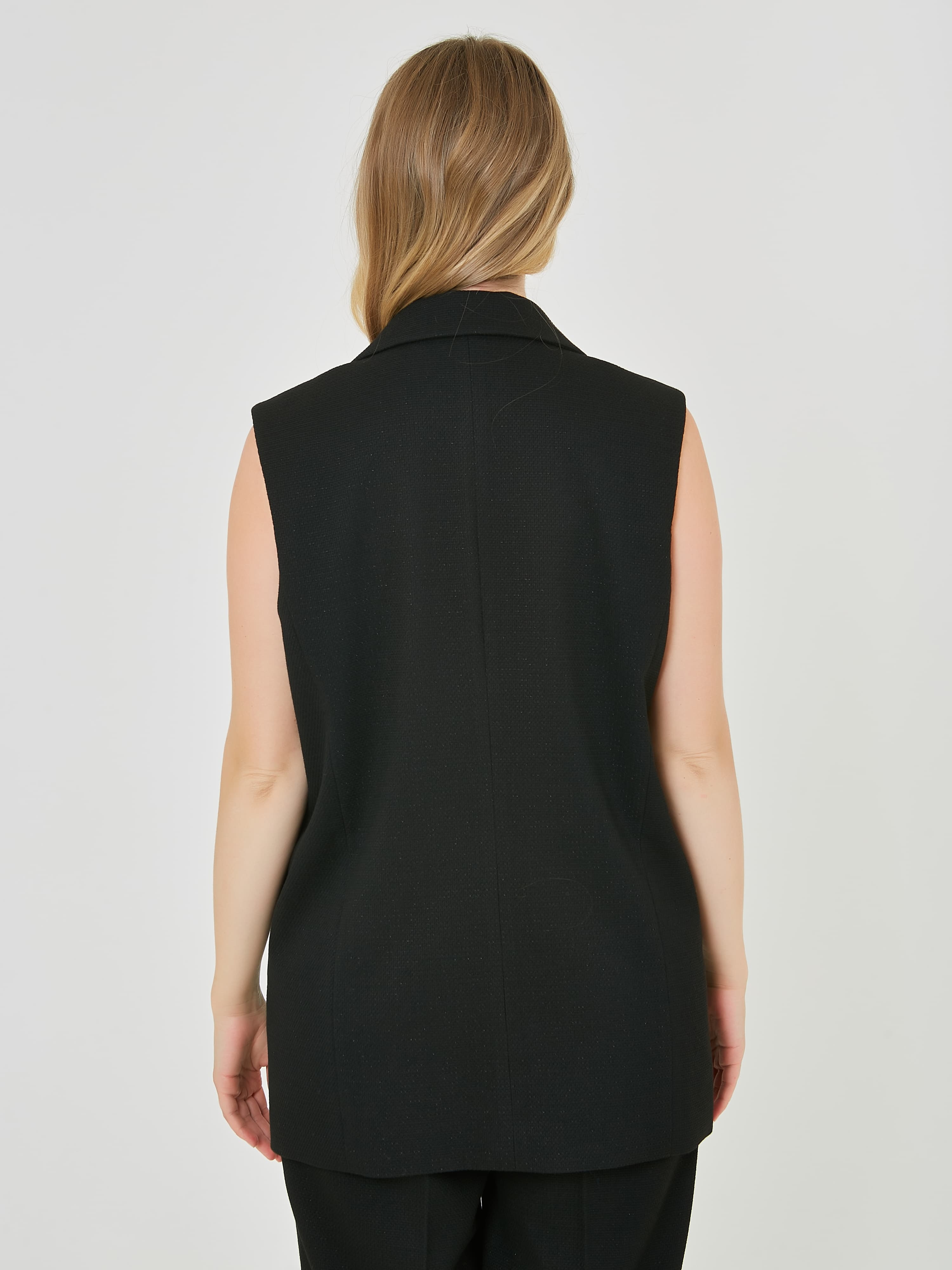Чёрный приталенный жилет из плотного материала. Застёгивается на 1 пуговицу. На передней части расположены два клапана. Осень-Зима'25/26. Капсула "Малахитовая шкатулка"