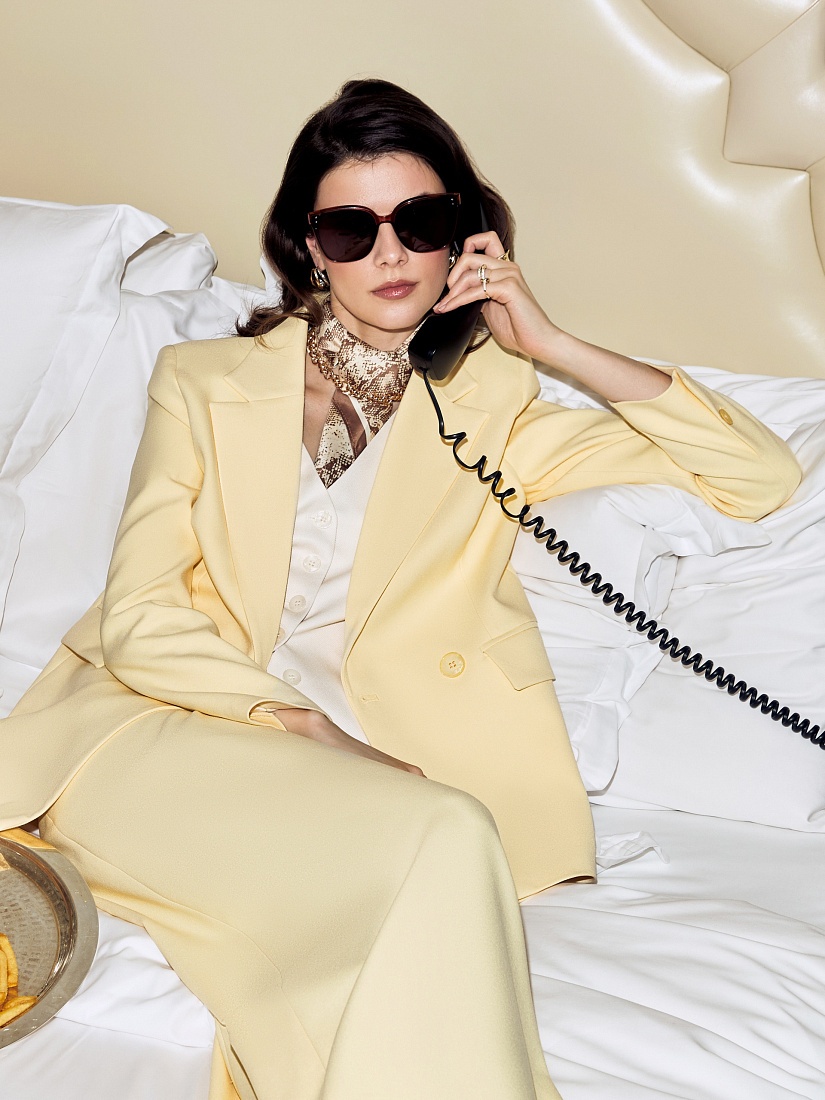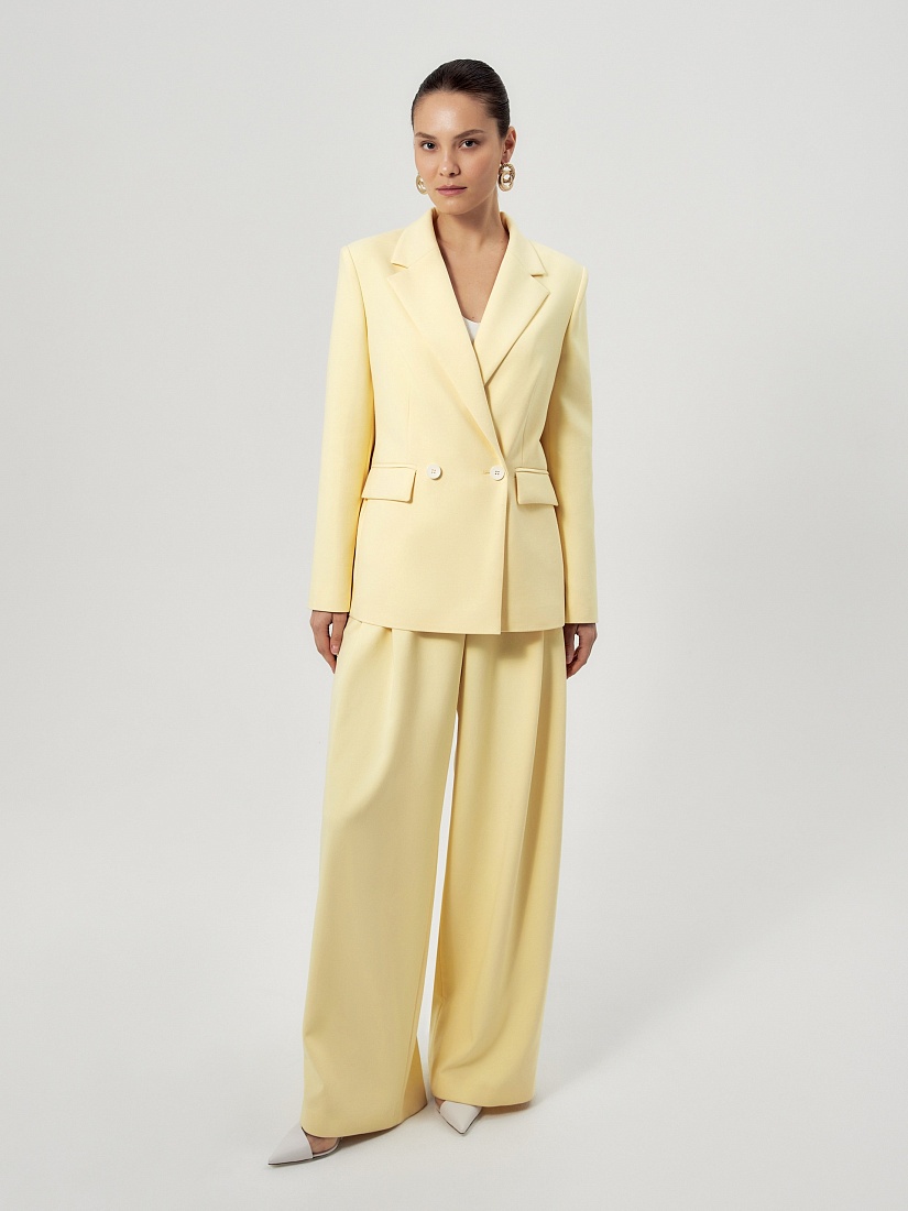 Удлиненный двубортный жакет прямого силуэта в нежно-желтом цвете из хлопковой костюмной ткани. Рукав полной длины с одной пуговицей на шлице. Прорезной карман с клапаном. Жакет на подкладке.